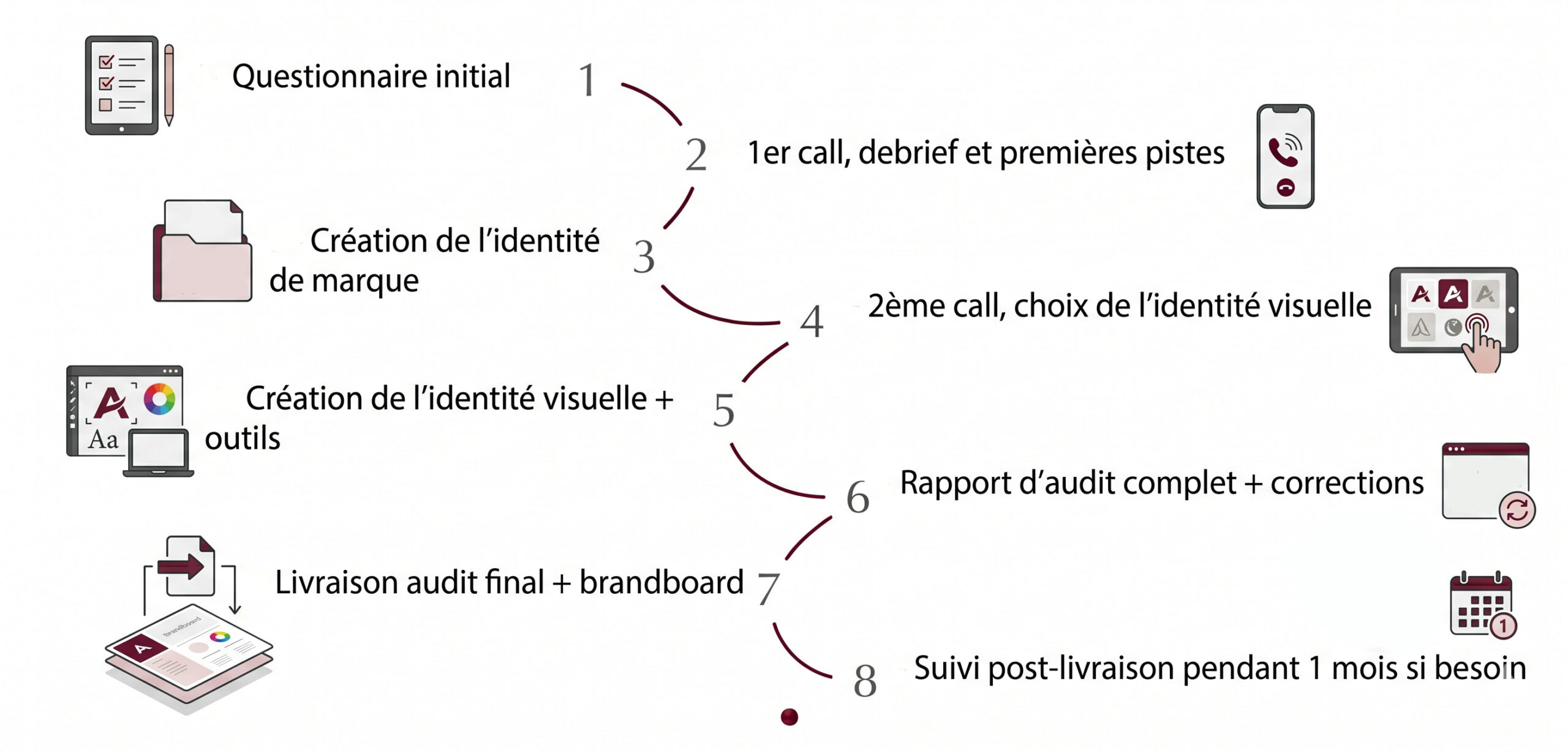 Après la remise de l'audit, l'accompagnement se poursuit pour que ton nouveau branding puisse se mettre en place de manière aisée.